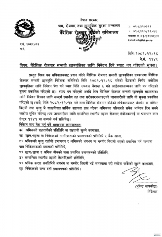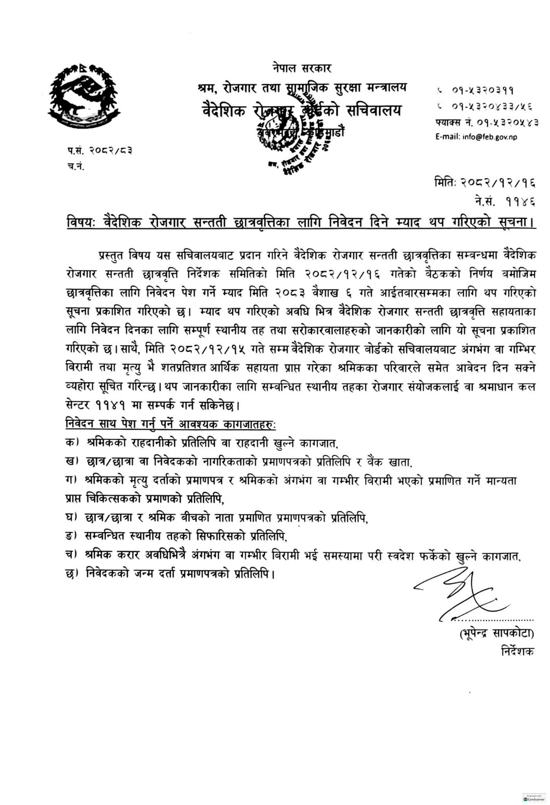 बैदेशिक रोजगार सन्नती छात्रवृतिका लागि निवेदन दिने म्याद थप सम्बन्धी सूचना