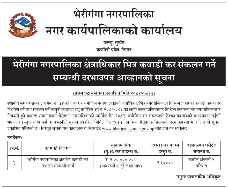 भेरीगंगा नगरपालिका क्षेत्राधिकार भित्र कवाडी कर संकलन गर्ने सम्बन्धी दरभाउपत्र आव्हानको सूचना।