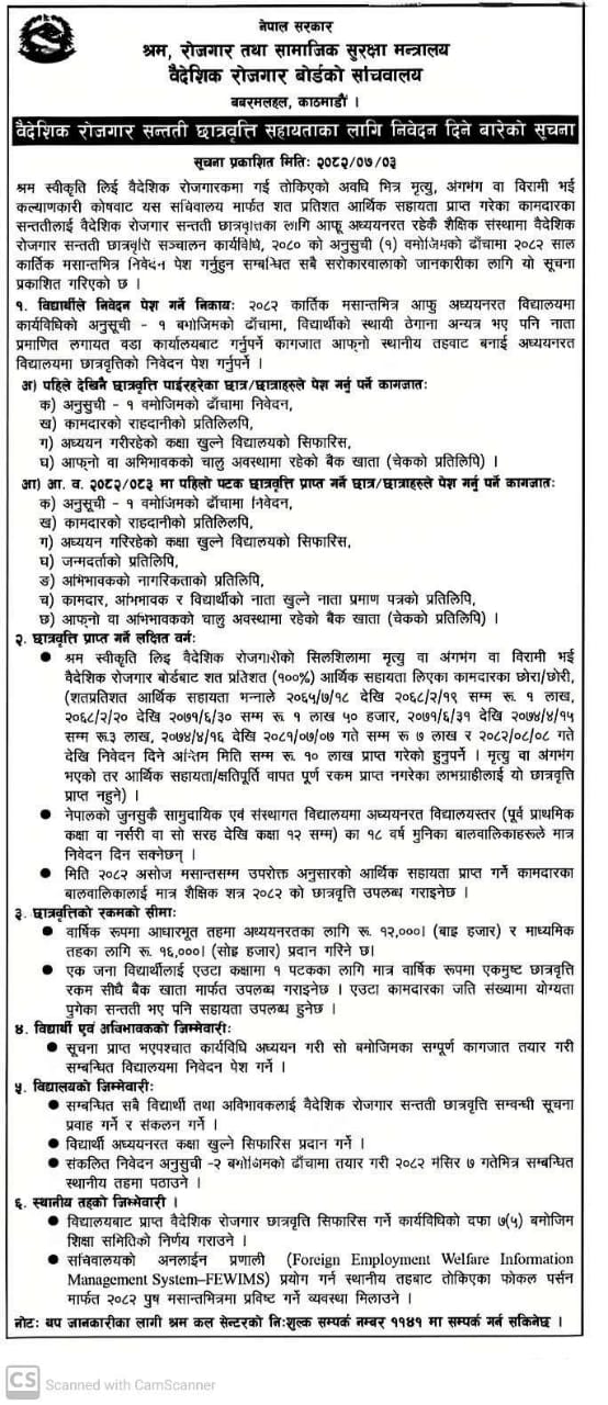 वैदेशिक रोजगार सन्तती छात्रवृत्ति सहायताका लागि निवेदन दिने बारेको सूचना।